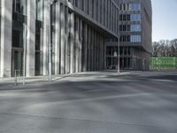 A sunny day in Berlin, Germany, showcasing modern architecture and urban design. The glass walls of the office building create reflections and shadows, adding depth to the city street.