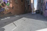 This image captures the vibrant city life of downtown Denver, Colorado, USA. The photograph showcases the unique urban design and classic architecture of the city. The road surface, made of low concrete and asphalt, leads to a small road and an alley-way where colorful graffiti covers the walls. The neighborhood is filled with art, from graffiti walls to intricate entryways and curbs. This photo highlights the energy and creativity of Denver's urban environment. It is a perfect representation of the city's vibrant culture and architectural charm.