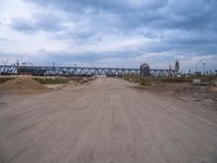 dirt road with train tracks under an overpass on the opposite track, and sand area below with vehicles and machinery