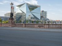 This image captures the vibrant city life of Berlin, Germany. The clear sky highlights the modern architecture and urban design of the city. The photo features a bridge with an asphalt road, where a man is riding his bike. On the other side of the street, there is a striking office building in the financial district. The image represents the bustling business district and the dynamic atmosphere of Berlin. It showcases the blend of historic and modern architecture that is characteristic of the city.