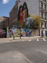 This is an image of a graffiti-covered wall in Berlin, Germany. The urban setting showcases the vibrant city life and unique urban design of Berlin. The graffiti on the wall adds a touch of artistic expression to the classic architecture of the buildings. The road in the foreground leads our gaze into the heart of the city, lined with architectural marvels. This photo captures the essence of Berlin's urban landscape and the blend of modern and traditional elements. Explore the streets of Europe's cultural and artistic hub with this stunning image.