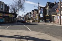 This is an image of a residential neighborhood in Toronto, Canada. The architecture in this town is characterized by classic designs and unique urban designs. The streets are lined with asphalt roads and curbs, creating a well-defined urban landscape. A clear sky overhead provides a beautiful backdrop to the city life. Street lights illuminate the thoroughfares, creating a vibrant and bustling atmosphere. This photo captures the essence of Toronto's art district, particularly the historic Kensington neighborhood. It represents the blend of classic architecture with modern urban design.