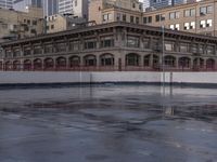 This is an image of a classic architecture building in downtown Los Angeles, California. The cityscape features a mix of apartments and condominiums with reflective facades. The open space plaza in front of the building is wet from the recent rain, creating a beautiful reflection. The clear sky in the background adds to the urban atmosphere. This photo showcases the urban design of the city and the combination of classic and modern architecture. It represents the vibrant city life of Los Angeles.