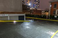 This stunning photograph captures the vibrant city life in Montreal, Canada. The image showcases a parking space surrounded by towering buildings and city lights at night, during a rain shower in the month of January. The artificial light illuminates the urban landscape, creating a captivating scene. The wet streets reflect the dazzling city lights, adding to the overall atmosphere. This photo is a perfect representation of the urban design and bustling city of Montreal.