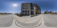A view of a modern architecture cityscape in Toronto, Ontario. The fish eye lens captures the vibrant city life with its buildings, roads, and infrastructure. The foreground showcases a busy business district.