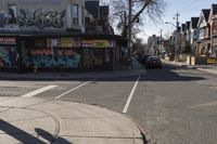 A classic Toronto street in the heart of Kensington neighborhood. Vibrant street art contrasts with the clear sky. Rows of stores and residential buildings line the road, accompanied by lush trees. A snapshot of urban design and city life.