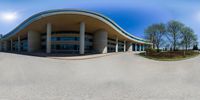A panoramic view of a modern office building in Toronto's business district. The sleek architecture and urban design create a vibrant city atmosphere. The elevated road and low profile of the building add to the dynamic composition.