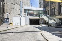 A view of a modern office building in the business district of Toronto, Canada. The straight road lined with urban architecture leads to the building's entrance. The bustling city life is reflected in the busy loading dock and surrounding public spaces.