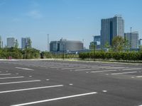 A clear sky over the urban landscape of the city. Asphalt surfaces and parking lots fill the cityscape, showcasing the hustle and bustle of city life and the urban design. A typical day in the city.