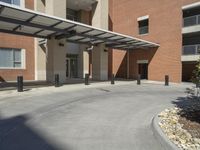 a building with a parking area next to it with a stone walkway and a carportion