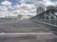 This image captures the modern architecture and urban design of Berlin, Germany. In the foreground, a paved parking lot with an open space in front of it is visible, contrasting with the large, gray city in the background. The clear sky above highlights the profile of the city's buildings. This photo represents the hustle and bustle of city life in Berlin, showcasing its unique blend of old and new, as well as its functional and innovative urban infrastructure.