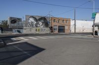 This image captures the vibrant city life in Los Angeles, California, USA. In a bustling residential neighborhood, a large mural of an old woman dominates the wall of a building. The black and white painting stands out against the classic architecture and graffiti wall of the city. The road surface, lined with asphalt, leads to a crossing at the heart of the town. The open space and clear sky provide a backdrop for the gallery district that surrounds the area. This photo represents the unique urban design and artistic atmosphere of Los Angeles.