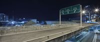 A night scene of a city skyline with a highway and road surface illuminated by street lights. The bridge and signage add to the urban atmosphere. Midnight sky sets the mood.