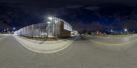 A mesmerizing view of a city street corner in Toronto at night, captured through a fish eye lens. The modern architecture of buildings in the financial district is illuminated by artificial light. The monochrome scene exudes a sense of urban sophistication.