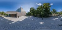 A skateboarder rides past an empty building in the city of Berlin, Germany. Modern architecture and urban design create a striking contrast against the clear sky. Straight roads and low-rise residential villas add to the charm of this urban landscape.