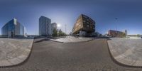 Panoramic view of modern architecture in the business district of Holland. Walkway and buildings are captured from a unique fisheye perspective. Clear skies and sunshine illuminate the city, creating a vibrant urban atmosphere.