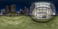 a circular mirror in the shape of an architectural structure in a city park, with a few benches and buildings and tall buildings in the background