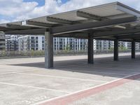 a couple of car parking bays are empty in the sun outside a building in a parking lot