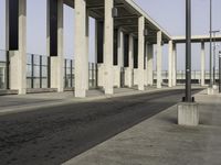 This is an urban cityscape featuring a parking lot with columns and a walkway between two building fronts. The architectural design of the buildings is notable, with a facade made of composite material. The scene is set during the day, with a clear blue sky spanning the background. The columns and walkway create a sense of symmetry and urban design. The parking lot is made of asphalt, providing a smooth road surface for vehicles. The buildings are bathed in shade, creating interesting tints and shades play. Overall, this image captures the beauty of urban architecture and design.