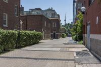 A classic Toronto street in a residential area, showcasing the city's architectural charm. The empty cobblestone road leads to a beautifully designed brick building. Clear skies add to the tranquil ambiance of this urban neighborhood.