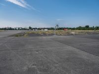 Aerial view of Berlin's urban landscape. Clear skies reveal a sprawling city with a mix of roads, parking lots, and open spaces. The city's stadium and basketball court stand out amidst the urban design.