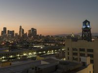 The cityscape of Los Angeles at dawn, with the afterglow of the sunset casting a warm atmosphere. The high-rise buildings and skyscrapers create a stunning urban design. Lights from windows illuminate the city.