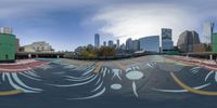 A view of a city skyline with modern architecture in Toronto. The reflection on the paved parking lot adds a touch of urban art. The clear sky contrasts with the colorful graffiti wall.