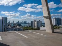 This stock photo showcases a breathtaking view of Miami's skyline, with skyscrapers and high-rise buildings dominating the cityscape. The image was taken from atop a building, capturing the bustling urban atmosphere of Miami on a sunny day. In the foreground, there is a parking area on the ground, adding to the city's vibrant energy. The mixture of clouds and blue sky above the concrete surface creates a stunning backdrop. This photo perfectly represents the vibrant city of Miami and its impressive skyline.