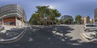 A bustling city street in Barcelona, Spain. Cafes, restaurants, and shops line the road, their storefronts casting hard shadows. The urban design showcases the vibrant city life of Europe.