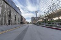 A lively street in downtown Los Angeles, with a blurred motion effect. The urban cityscape showcases the architectural diversity and vibrant city life. Straight down the road, the asphalt lane leads to an inviting neighborhood.