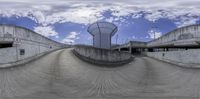 A fisheye view of a city street with an elevated bridge and a straight road leading to the horizon. The concrete street and asphalt road surface create a symmetrical composition. Open space and a parking lot provide shade on a sunny day.