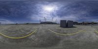 An elevated view of a city street with straight down the road symmetry. The concrete road surface and parking lot are bathed in sunlight, contrasting with the shade under the bridge. The blue sky reflects in the calm lake, creating a serene urban landscape.