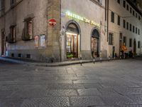 This stock photo features an empty city street in Florence, a beautiful city located in the region of Tuscany, Italy. The photo was taken at night, capturing the tranquility and charm of the city. The street is illuminated by artificial lights, creating a captivating play of light and shadows. In the distance, you can see the silhouette of a cafe, restaurant, and bar, offering a cozy and inviting atmosphere for those looking to eat out or enjoy a drink. The image also showcases a serene garden and the surrounding landscape, adding to the overall aesthetic appeal. The photo perfectly captures the essence of Florence, a city known for its rich history, art, and architectural beauty. This stock photo is ideal for various projects related to travel, Europe, Italy, or urban cityscapes.
