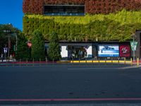 This photo shows a street in Taiwan with green walls and people on the side of it. There are two buildings in the background. The asphalt road is filled with shadows and lined with shops and storefronts. The bustling city of Taiwan is captured during the day, with hard shadows and a busy shopping mall in the distance.