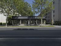 A clear sky day in Berlin, Germany. Modern architecture lines the city streets, with roads paved in asphalt. A vibrant urban design showcases the city's lively restaurant scene and residential areas.