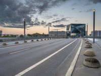 city streets with empty highway and a modern looking building on horizon behind them by cloudy sky