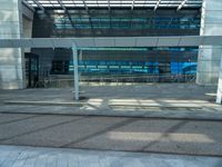 This image captures the modern architecture and urban design of a business district in the Netherlands. The glass building in the background is surrounded by an empty parking lot. The composite materials used in the building's facade give it a sleek and modern look. The stairs on either side lead to the entrance of the building. The city life can be seen with the presence of road surface, asphalt, and curbs. Vegetation adds a touch of greenery to the urban environment. This photo represents the bustling business atmosphere and contemporary architecture of Holland.