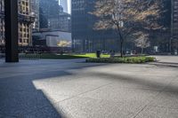 This image captures the impressive architecture and cityscape of Toronto, Ontario, Canada. The modern buildings, including high-rise condominiums and office towers, create a stunning backdrop against the clear blue sky. The open spaces, plazas, and walkways provide a welcoming atmosphere for pedestrians. The shadows cast on the ground add depth and visual interest to the urban design. In this bustling business district, a man is seen walking through the park, enjoying the vibrant city life. This photo showcases the harmonious blend of architecture, public spaces, and city life in Toronto.
