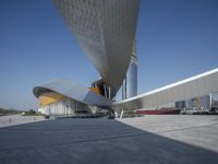 an empty concrete plaza with a futuristic building in the background and a blue sky overhead