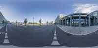 Aerial view of Berlin's financial district. Modern architecture and office buildings dominate the cityscape. Straight roads lead to the business district surrounded by residential areas. Clear skies and tree-lined streets create a vibrant urban design.