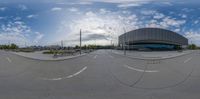 A view of a modern architecture building in the financial district of Berlin, Germany. The cityscape is filled with high-rise office buildings and a bustling business district. The parking lot is filled with vehicles, adding to the urban energy of the scene.