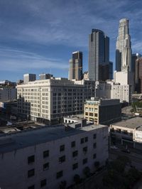 A stunning cityscape of Los Angeles, California, USA with a large white building featuring lots of windows standing tall in the middle of the bustling metropolis. The modern architecture blends effortlessly with the urban design of the city, creating a picturesque skyline dominated by skyscrapers and high-rise buildings. The open space and clear sky allow the sun to illuminate the concrete surfaces, casting a bright and sunny atmosphere over the city. This vibrant metropolitan area exudes a sense of energy and vitality, making it a perfect representation of city life in the sunny Los Angeles.