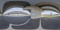 A bustling cityscape captured through a fish-eye lens. The concrete bridges and overpasses create a symmetrical and straight view down the road. The clear sky and sunny weather highlight the urban design and infrastructure of the metropolitan area.