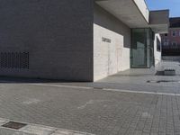 This photo captures a modern architecture building in Germany. The street in front of the building is lined with benches and signs, creating a vibrant urban atmosphere. The asphalt road surface, grey curbs, and composite material flooring add to the contemporary feel of the scene. The clear sky in the background highlights the city's beauty. This stunning cityscape represents the fusion of architecture and urban life in Europe.