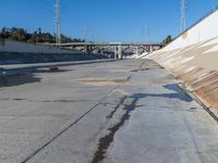 This stock photo depicts a cityscape of Los Angeles, California, USA. The image features concrete streets, asphalt roads, and a river flowing through the city. The residential area is surrounded by trees and has a bridge crossing the river. The photo was taken during the day and shows a composite material road surface. In the background, there are overhead power lines, street lights, and clear skies. The image also showcases a slope and a wall made of concrete. Experience the suburban atmosphere and the vibrant energy of Los Angeles in this captivating photo.