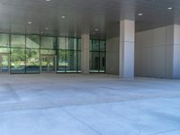 Modern architecture in the heart of Los Angeles. An empty building with sleek glass doors showcases the city's urban design. The open space and concrete surface create a contemporary vibe.