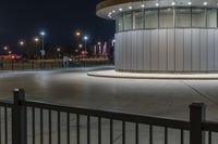 This stock photo features a stunning cityscape at night in Toronto, Canada. The image showcases a modern white building illuminated by bright lights, with a street light casting a warm glow. The city is bustling with energy, with various infrastructure and architectural elements such as a bus stop, a warehouse, and a concrete surface. The artificial light creates a mesmerizing ambiance, perfectly capturing the essence of city life in this metropolitan area. The image highlights the innovative urban design and the seamless integration of modern architecture into the urban landscape. The night setting adds an element of mystery and intrigue to the photograph, making it a captivating visual representation of Toronto's vibrant cityscape.