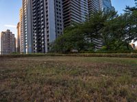 A beautiful cityscape photo of Taichung, Taiwan showcasing the urban design and vibrant city life. The image features a large grassy area with many tall buildings in the background, surrounded by bushes on both sides. The open space provides a refreshing break from the bustling business district, making it a great spot for relaxation or a leisurely walk. This cityscape captures the essence of urban living in Taiwan, with its modern office buildings, cloud-filled skies, and perfectly manicured grass surface. Whether you're a local resident or a visitor, this image showcases the dynamic energy and charm that can be found in this bustling Asian city.