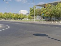 Modern architecture in Berlin, Germany. Clear sky and urban design contrast with the green grass and vegetation. A road with asphalt surface leads to a thoroughfare lined with street lights.