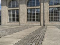 a large brick building that has some windows near by it on the street and next to a brick walkway